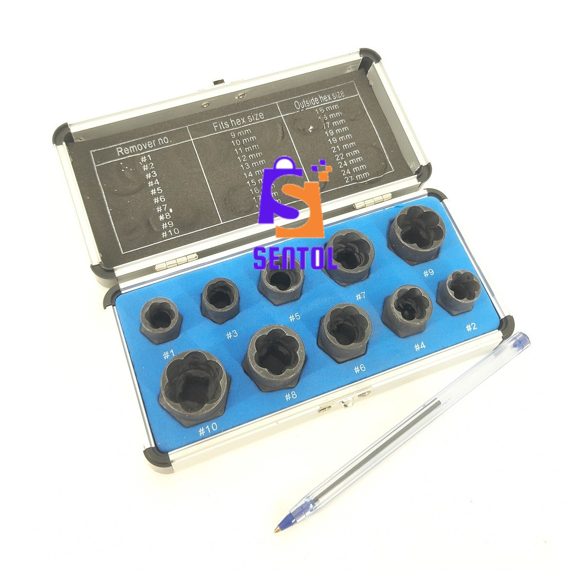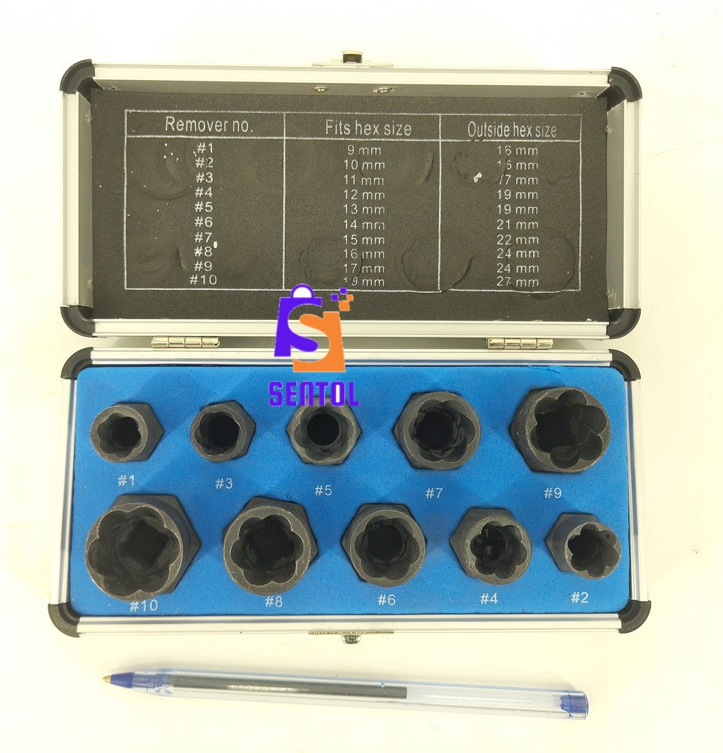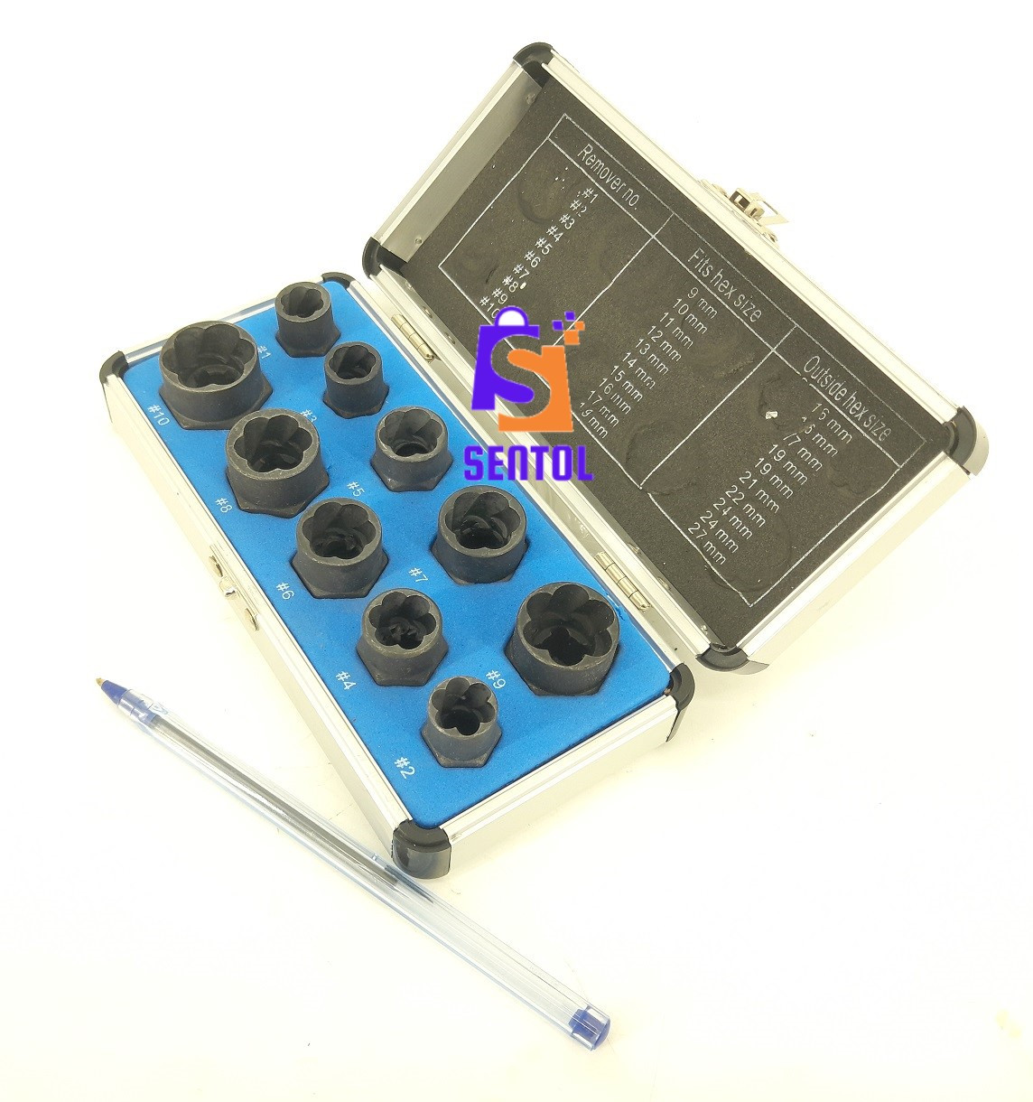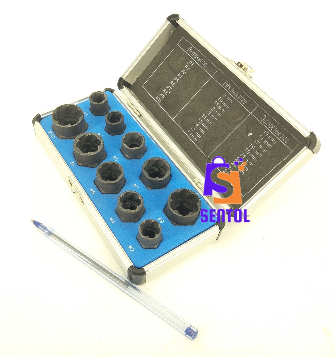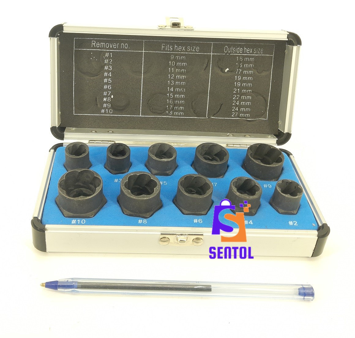 – 10 remover sockets to help remove nuts, bolts, screw heads, studs, etc.