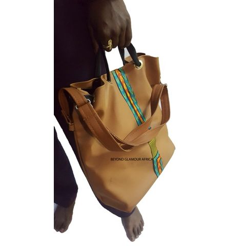 Beige Ladies Leather Ankara Print Handbag
