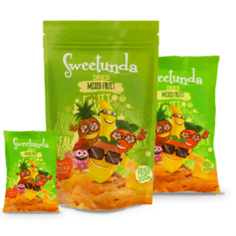 Dried mango, banana and pineapple mixed with raspberry and strawberry rolls. A party in a pouch!