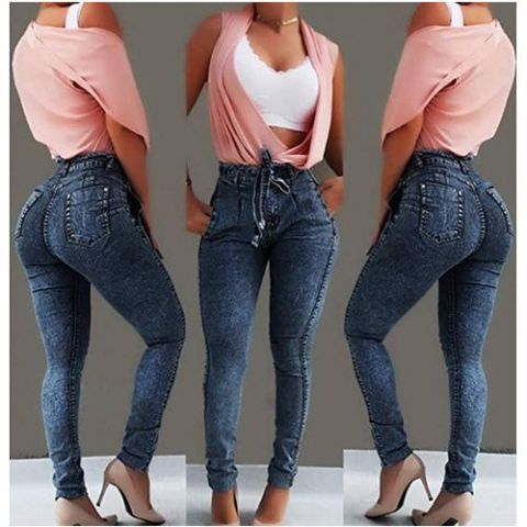 Fashion Dark Blue High Waist Jeans, Elastic Slim Fit Ladies Pants