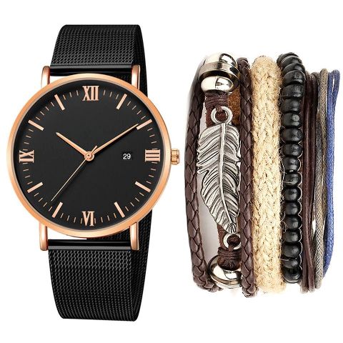 New Luxury Watch Round Dial Stainless Mesh Strap Band Men Date Quartz Wrist Watch Bracelet