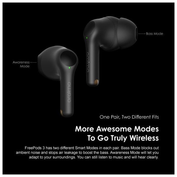 FreePods 3 has two different Smart Modes in each pair. Bass mode blocks out ambient noise and stops air leakage for bass boost. Awareness Mode will let you adapt to your surroundings. You can still listen to music and will hear clearly.