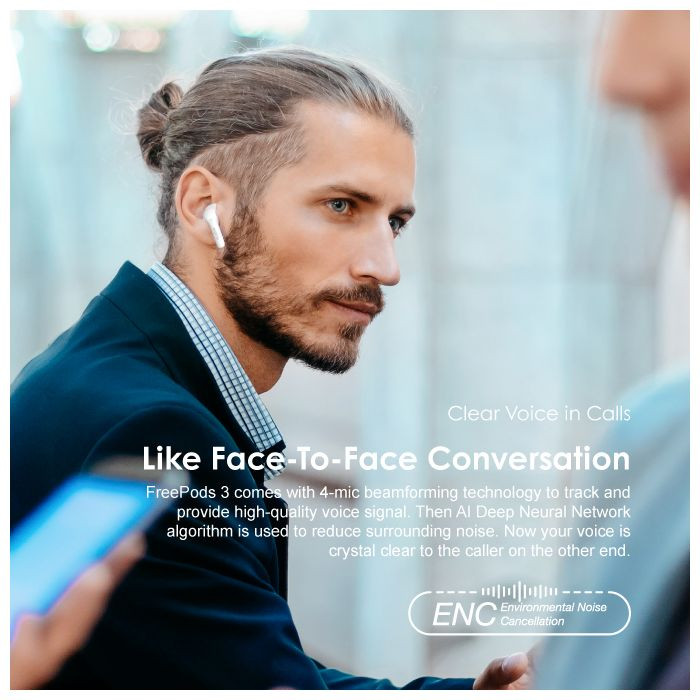 FreePods 3 comes with 4-mic beamforming technology to track and provide high-quality voice signal. Then AI Deep Neural Network algorithm is used to reduce surrounding noise. Now your voice is crystal clear to the caller on the other end.