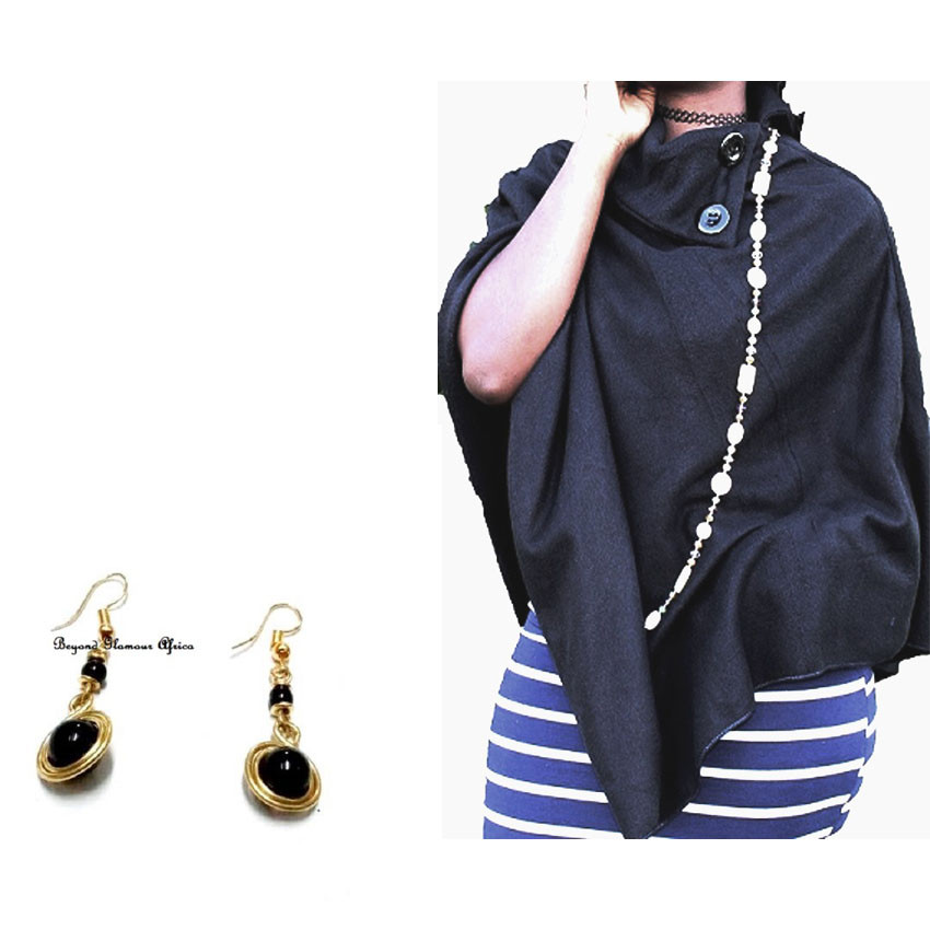 Black poncho , a high neck with chunky buttons,the poncho is made of soft cotton to keep you warm and comfortable,its one size hence fits all body types,it goes well with all outfits colors and design,stay trendy