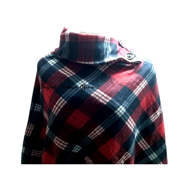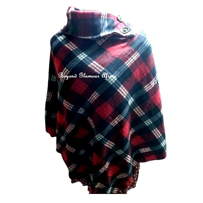 Poncho , a high neck with chunky buttons,the poncho is made of soft cotton to keep you warm and comfortable,its one size hence fits all body types,it goes well with all outfits colors and design,stay trendy