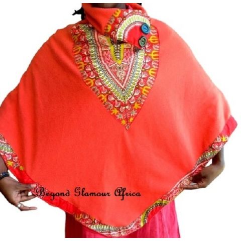 Womens Orange Poncho with dashiki print