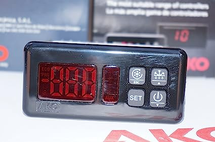 Universal Digital Thermostat AKO D-14323 (230v) with 2 temperature-sensors. All-purpose Digital Temperature Controller for Commercial Freezers. Temperature controller Range from -50ºC to +99ºC, 3 relays, panel mounting. AKO is one of the best OEM replacement digital thermostats for many refrigeration and freezers manufacturers (such as Beverage-air & Ojeda). AKO digital controller thermostats can replace 100% of all mechanical and digital thermostats and can be used for all freezer & refrigeration equipment with no limit of equipment size. Included: Digital thermostat, 3 contacts (compressor, fan, defrost heater), 2 temperature-sensors, Fahrenheit and Celsius readings, mounting bracket, automatic defrost timer, adjustable -50F +250F. Applications: Industrial and commercial refrigeration, display cabinets, electrical panels, industrial freezers, walk in freezers, industrial chest freezers, commercial upright freezers, restaurant freezers, glass door freezers, etc. Additional Information: * Range from -50,0 ºC to +99,9 ºC, 3 relays, panel mounting. * Compressor, fan and auxiliary relay. * Auxiliary relay programmable as Defrost, Alarm or Light. * Defrosts programmable by controlling compressor, resistances (or cycle reversal) and fans. * Optional probe allows defrosting by temperature. * Programmable digital inputs such as door switch, external alarm, remote defrost, energy saving or continuous cycle. * Configuration wizard depending on application (8 configurations). Available: AKO D-14312 (12v/24v), AKO D-14320 (120v), AKO D-14323 (230v)