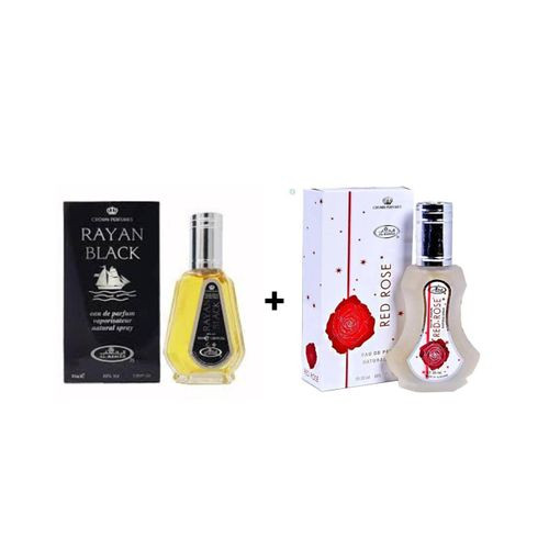 Al Rehab Rayan Black & Red Rose Couple Bundle – a perfect his & hers perfume set. Bold masculine notes meet romantic rose elegance, making it the ideal gift for couples.