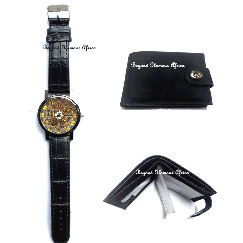 Mens Black Leather skeleton watch with wallet