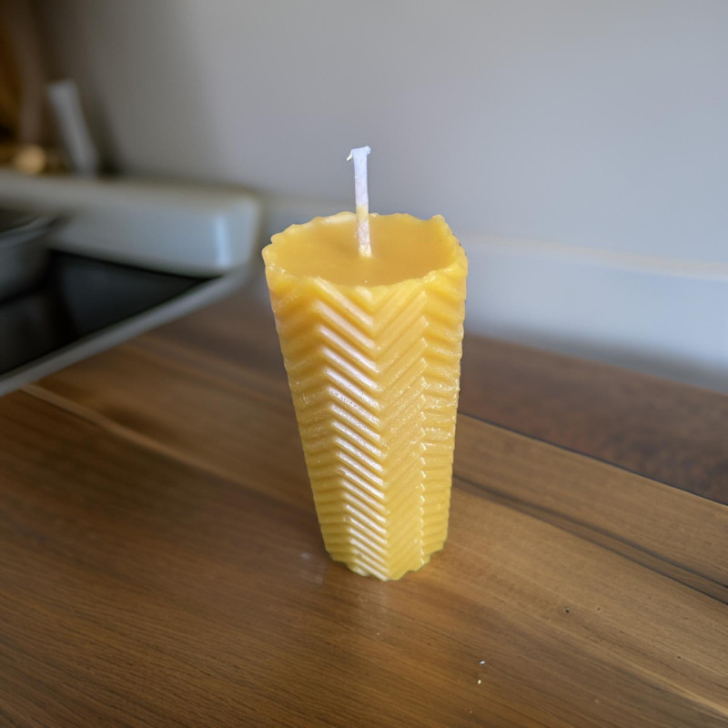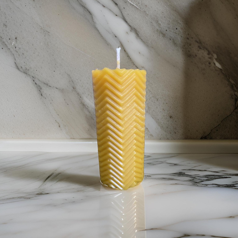 Featuring a modern chevron pattern, this stylish candle is made from beeswax, bringing a trendy yet natural touch to your décor. You can enjoy its subtle honey aroma or enhance it with one of our signature scents. This candle not only adds visual texture to your space but also helps clean the air, making it an attractive, sustainable décor piece that complements any contemporary interior.