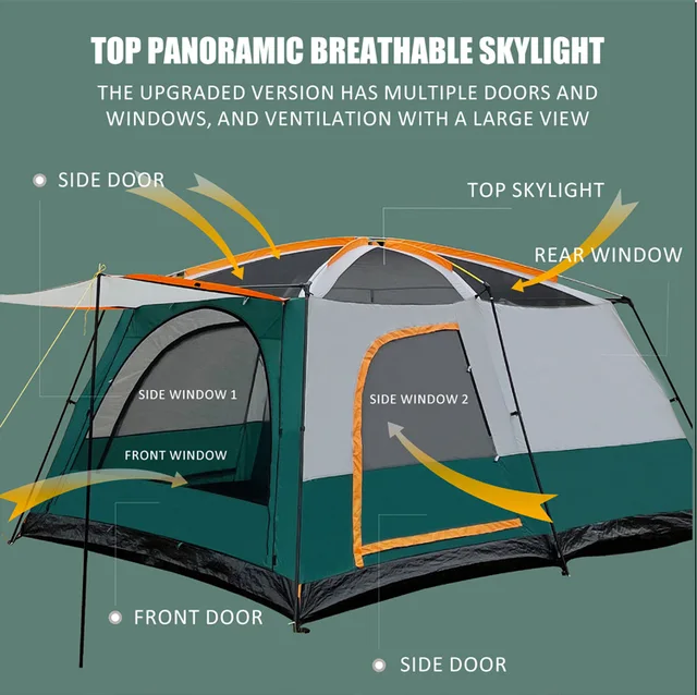 • Unique design: 2 Bay-Windows with Mesh,3 doors 3 Windows with mesh,divided into two rooms by separation curtain.and more comfortable. If the door curtain supports by two poles, it becomes a sunshade canopy.
