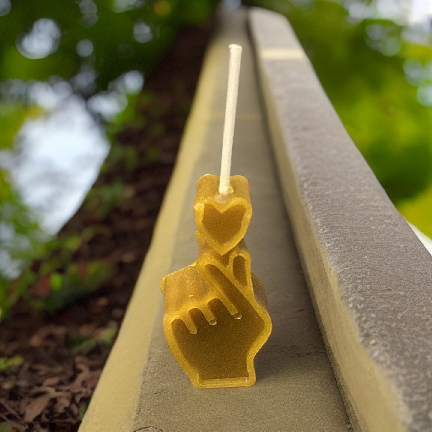 This beeswax candle is molded into the iconic finger heart symbol, complete with a small heart at the top, radiating warmth and affection. The gentle honey aroma or one of our personalized scents adds a soothing touch, making it an ideal centerpiece for intimate spaces or gifting to loved ones. The candle’s natural ingredients are both sustainable and uplifting, offering a heartfelt décor element that’s as meaningful as it is stylish.