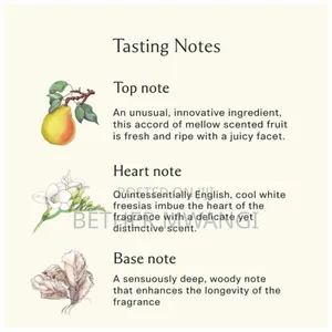A rich body crème that moisturizes skin while covering it in the scent of English Pear & Freesia. The sensuous freshness of just-ripe pears is wrapped in a bouquet of white freesias and mellowed by amber, patchouli and woods. King William pear opens the scent. An unusual, innovative ingredient, this accord of mellow scented fruit is fresh and ripe with a juicy facet. Freesia defines the heart. Quintessentially English, cool white freesias imbue the heart of the fragrance with a delicate yet distinctive scent. Patchouli grounds the scent. Patchouli is a sensuously deep, woody note that enhances the longevity of the fragrance.
