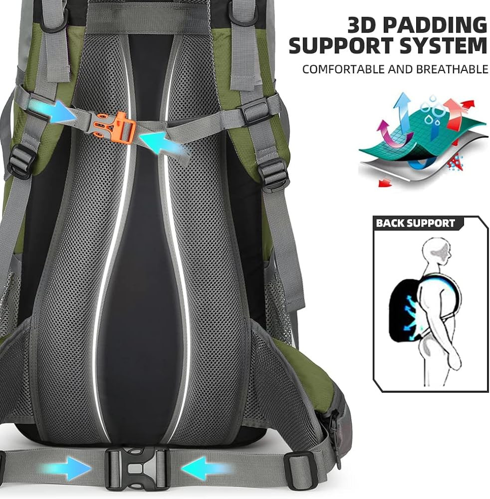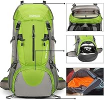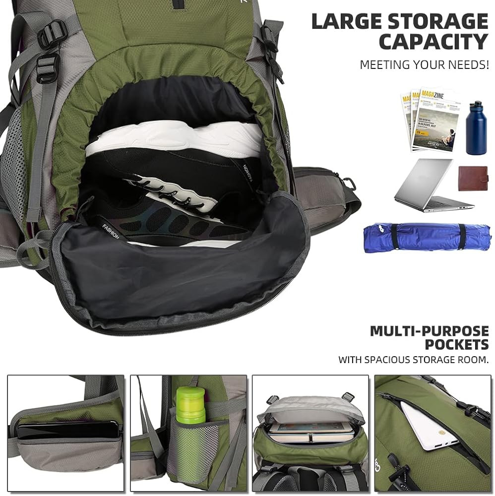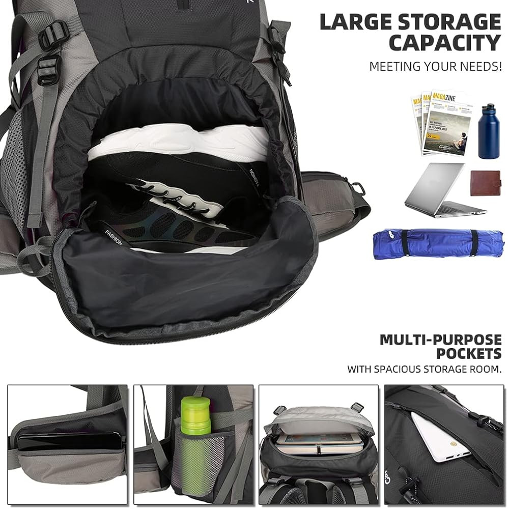【Waterproof Backpack】The backpacking backpack made of waterproof nylon material and come with extra rain cover on the bottom pouch, double protection, prevent the water and dust into the backpack, protect your valuables from heavy rain and keep everything dry.