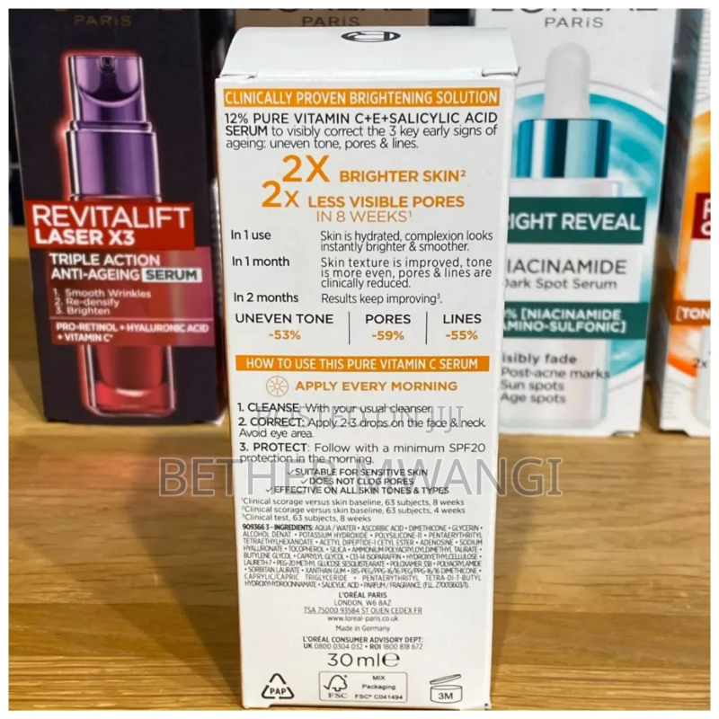 It's formulated with 12% pure vitamin C, vitamin E& Salicylic acid to brighten skin and reduce the signs of ageing which are uneven skin tone + pores & lines. One can see the difference on the face after using this for about a week and the skin becomes more bright and smoother.