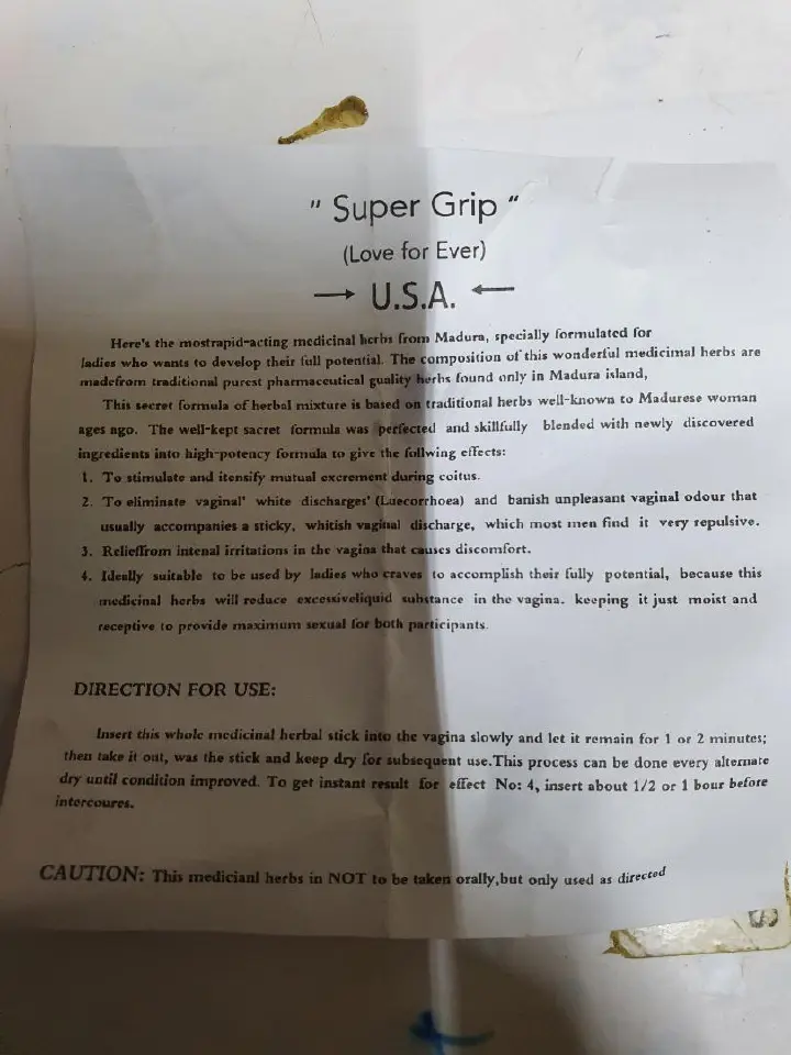 Insert this whole medicinal herbal stick into the vagina slowly and let it remain for 1 or 2 minutes; then take it out, was the stick and keep dry for subsequent use. This process can be done every alternate dry until condition improved. To get instant result for effect No: 4, insert about 1/2 or 1 bour before intercoures.