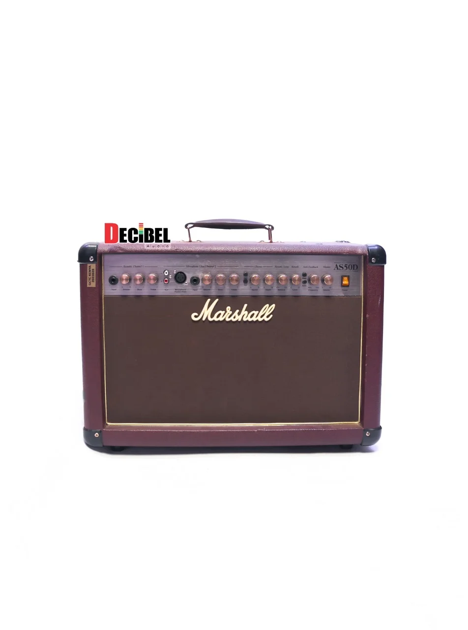 TheMarshall AS50D Acoustic Amplifier by Model offers an impressive range of features. This acoustic amp utilizes Solid State technology and boasts two channels for versatile performance. The electronic components include an output wattage of 50W and various outputs such as DI out, line out, and effects loop. In terms of inputs, it provides two instrument jacks, one Phono (Aux) In, and one XLR input, along with a Footswitch for added convenience. The controls offer adjustments for volume, bass, treble on the acoustic channel, and volume, bass, and treble on the microphone/aux channel. It also includes options for chorus channel selection, chorus effect speed, chorus effect depth, reverb balance, reverb level, anti-feedback frequency sweep, and overall volume control. The AS50D is equipped with built-in reverb and chorus effects, making your acoustic sound truly stand out. Additionally, it features an effects loop with Send/Return functionality. The speaker configuration consists of two 8″ custom speakers with a tweeter, resulting in a rich sound experience. The unit impedance is 4Ω, ensuring compatibility with various setups. The AS50D can be further enhanced with accessories such as the PEDL-91003 footswitch (sold separately) for convenient control, a detachable power cable included for easy setup, and an optional dust cover (M-COVR-00025, sold separately) to protect your investment. With dimensions of 550 mm (width) x 415 mm (height) x 255 mm (depth), including feet and handle, it offers a portable and compact design. Experience the versatility and high-quality sound of the AS50D Acoustic Amplifier by Model.