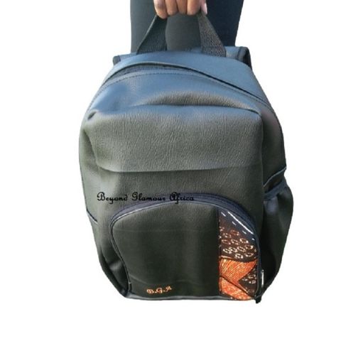 men and women's Black Leather with brown ankara laptop Backpack