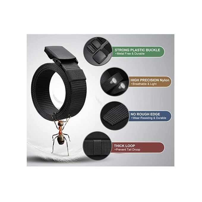 • Premium Material: High Strength YKK Nickel Free Plastic Buckle and Nylon Strap Does not contain metal. Quickly pass through airport security without removing your belt. Smooth plastic lid at the end of the belt, to prevent thermal cutting ends from scratching skin and fabric.
