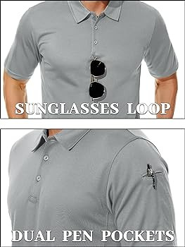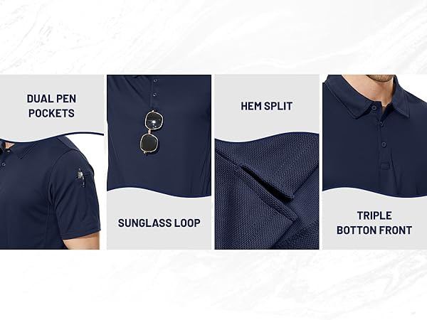 • Feature: 3-button classic polo shirts with spread collar, sunglasses and microphone loop under the buttons, dual pen pockets on left sleeve for your convenience.