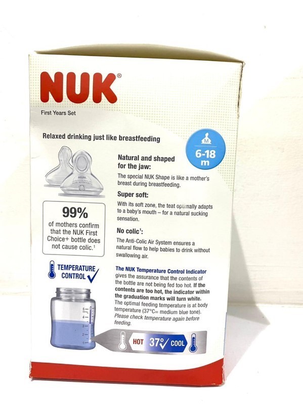 The NUK Disney Smooth Flow Bottle & Pacifier First year set combines the soothing and calming qualities of NUK Smooth Flow bottles and orthodontic nipples along with the Disney designs your baby loves. All nipples on the two bottles, the cup, two replacement nipples, and two orthodontic pacifiers are designed to soothe and calm baby while promoting healthy oral development. This Smooth Flow bottle nipple adjusts the flow based on how your baby drinks, adapting to their suction strength to ensure they will always have the right flow rate. The SafeTemp temperature indicator lets you know when milk is too hot with just a glance. The blue thermometer indicator fades when milk is too hot and reappears when milk has cooled and is safe to drink. All items in this first year set are top-rack dishwasher safe and BPA free.