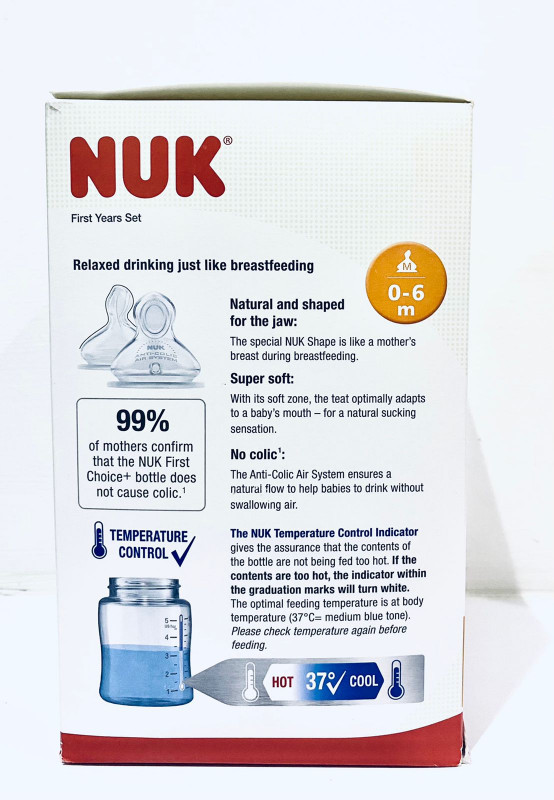 The NUK Disney Smooth Flow Bottle & Pacifier Newborn Set combines the soothing and calming qualities of NUK Smooth Flow bottles and orthodontic nipples along with the Disney designs your baby loves. All nipples on the two bottles, one cup, two replacement nipples and two orthodontic pacifiers are designed to soothe and calm baby while promoting healthy oral development. This Smooth Flow bottle nipple adjusts the flow based on how your baby drinks, adapting to their suction strength to ensure they will always have the right flow rate. The SafeTemp temperature indicator lets you know when milk is too hot with just a glance. The blue thermometer indicator fades when milk is too hot and reappears when milk has cooled and is safe to drink. All items in this newborn set are top-rack dishwasher safe and BPA free.
