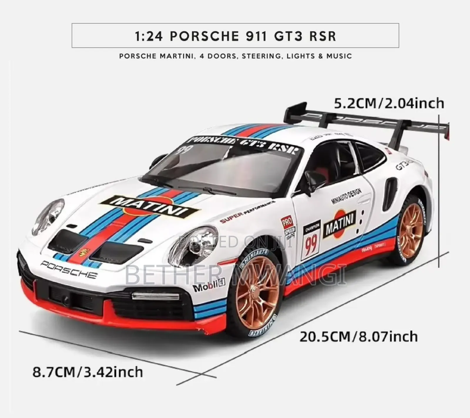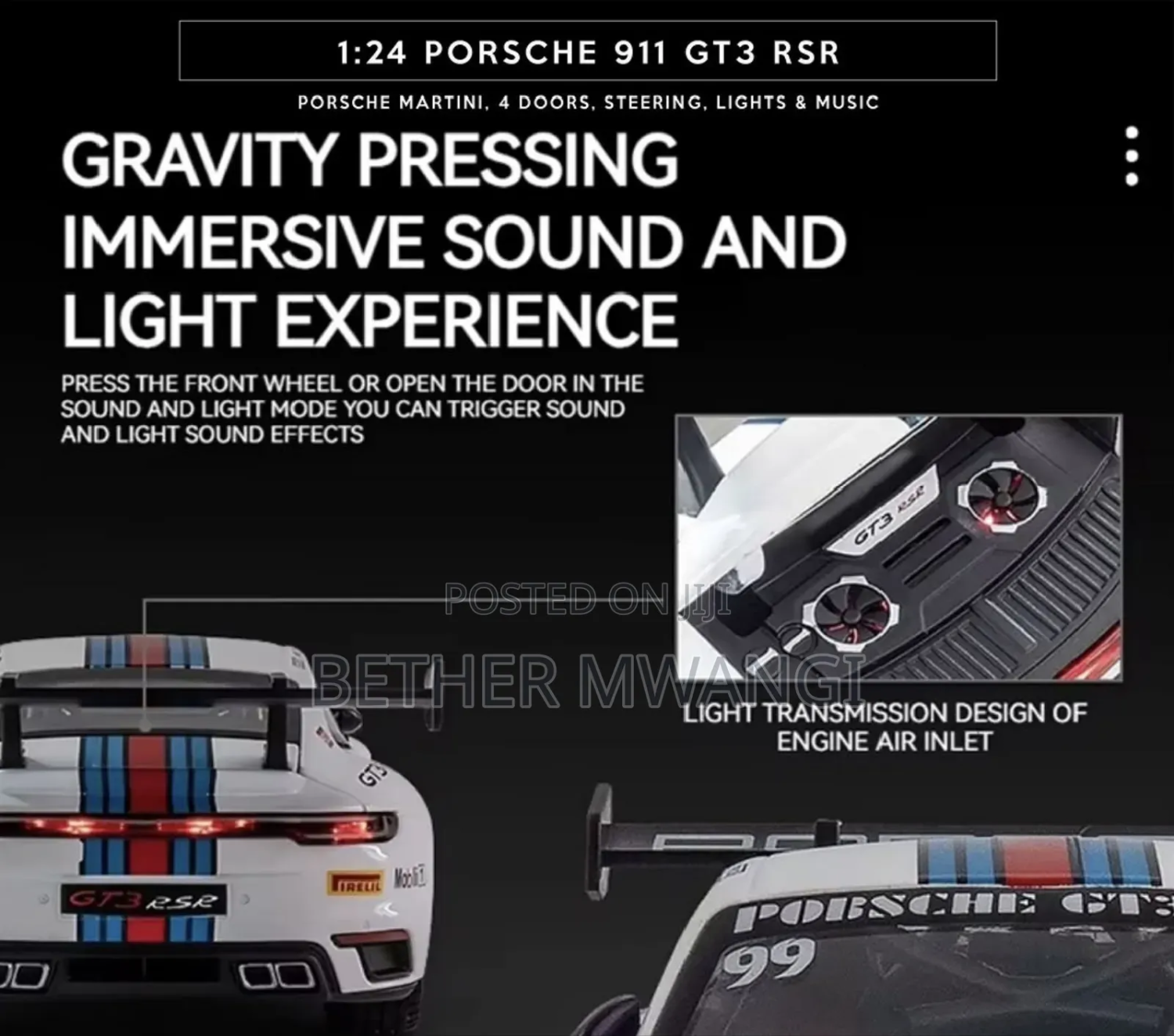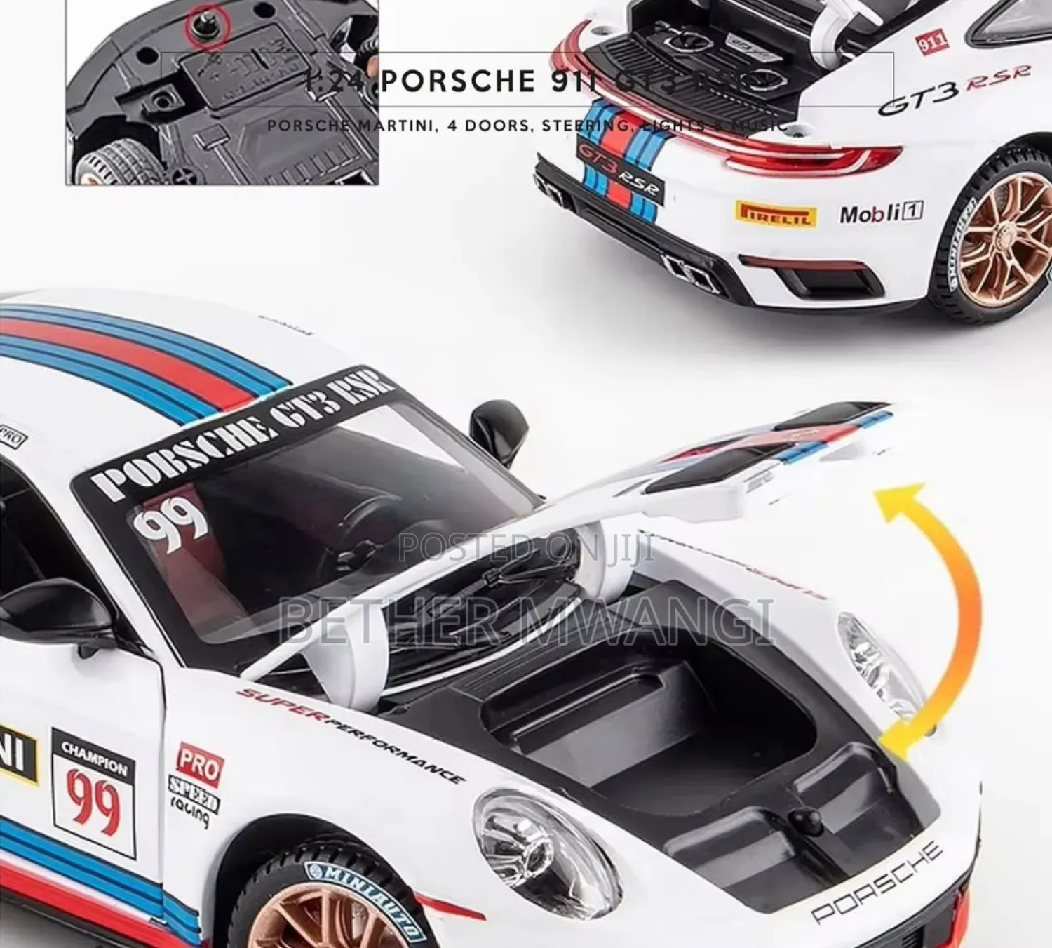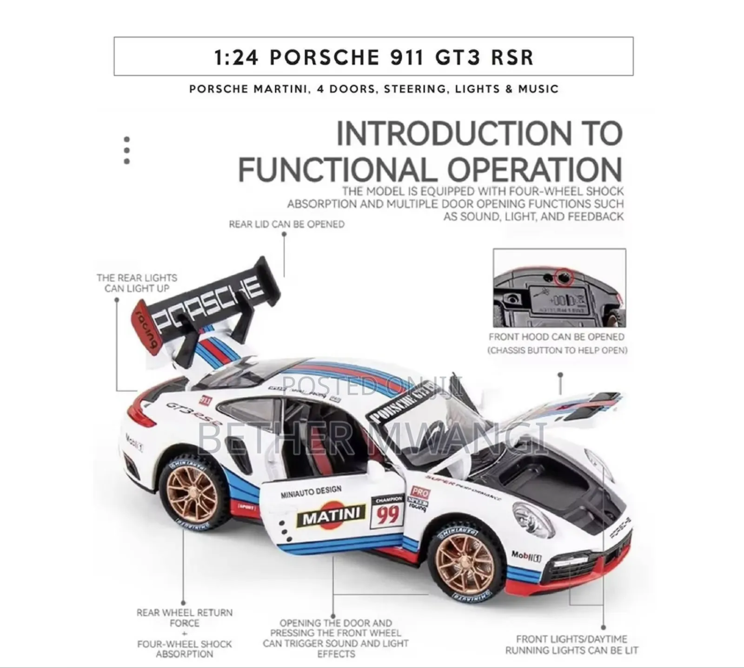 The front wheel is steered, the rearview mirror can be opened, and has the function of sound and light return. Immersive sound and light experience, in sound and light mode, press the front wheel or open the door to trigger the sound and light effect. Cool big tail design: There is a big tail for the track at the tail. The front hood and hood can be opened, and the analog chassis front and rear with buttons help to open the hood. The front wheel steering function is connected to the steering wheel to simulate a real ca steering the steering wheel steerable front wheels Battery-free pul-back function: Press your body on the ground, pull a distance, let go, and move forward automatically