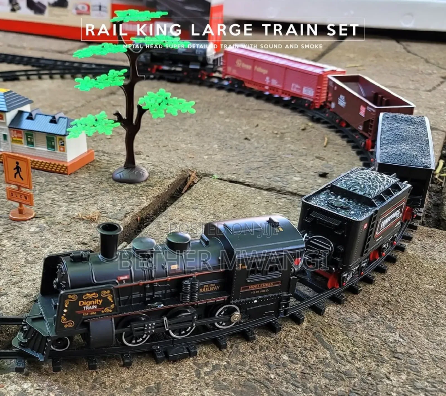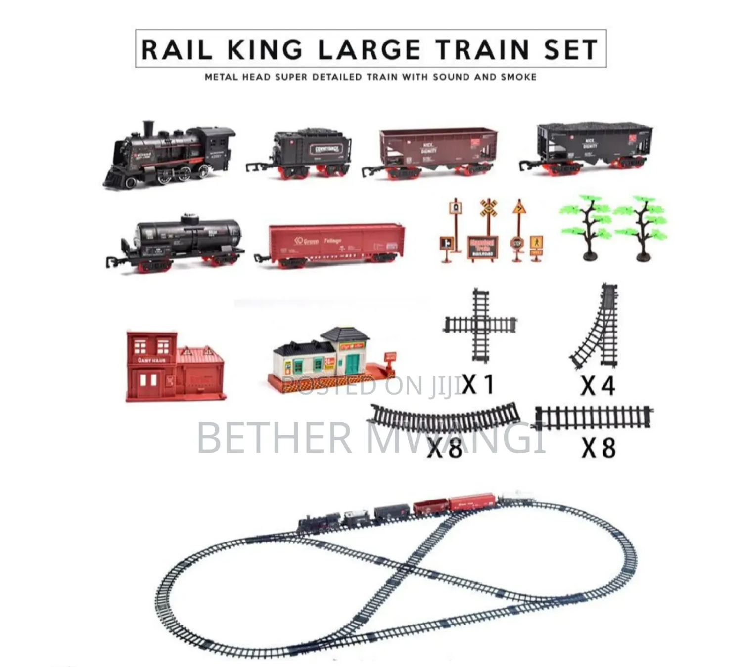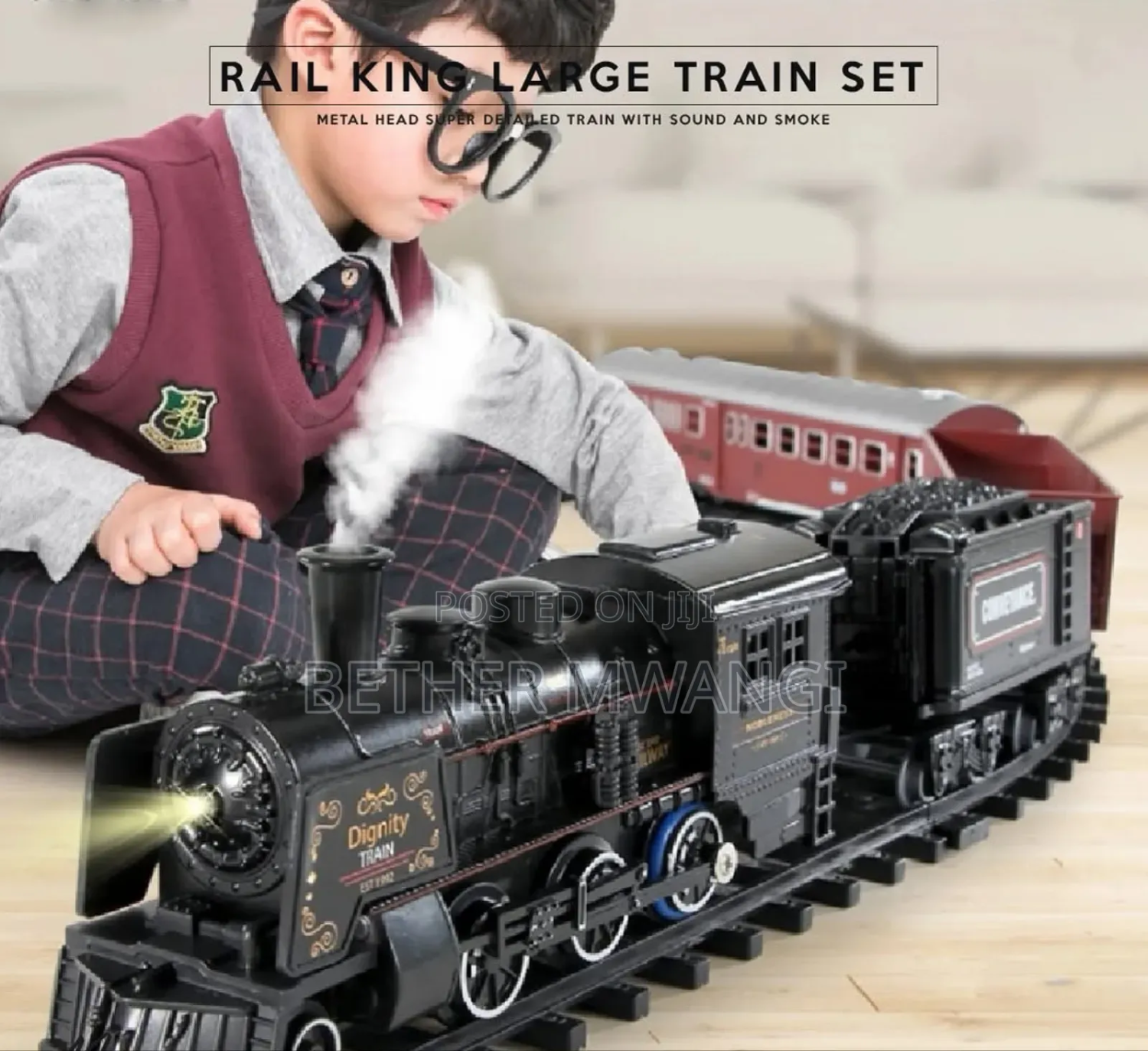Scene simulation: realistic train shape and track. We are equipped with different types of carriages and traffic signs for you, which can simulate real train scenes, which can help children improve their perception.All of our parts are made of high-quality materials that are non-toxic. The body is made of high-quality alloys, thick and textured, exquisite locomotives, flashing lights and music, and the chimney can produce heat. The smoke effect simulates the smoke of classic real draught vapour and produces white smoke which is hygienic and non-toxic. Multi-track train: the rails can be spliced and built into a variety of shapes. Kit includes: locomotive steam engine, cars, trucks, coal cars, rails, traffic signs. The train must use 4AA batteries for power supply. Batteries Included. Power source: wired, electric