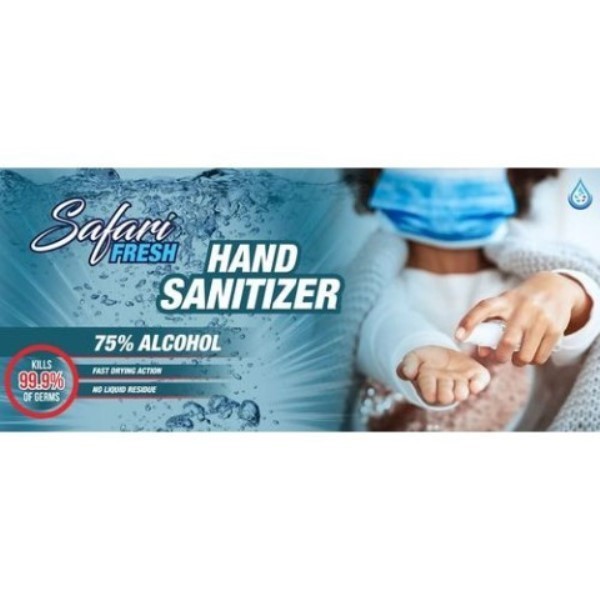 Safari Fresh Hand Sanitizer is a 70% alcohol based liquid/gel that kills 99.9% of germs and is gentle on hands. Its fast drying action leaves no sticky/liquid residue and is specially formulated for use in high risk areas. It has a broad spectrum of anti-microbial activity to instantly kill 99.9% of VIRUSES, BACTERIA, SPORES, GERMS and FUNGI that cause illness.