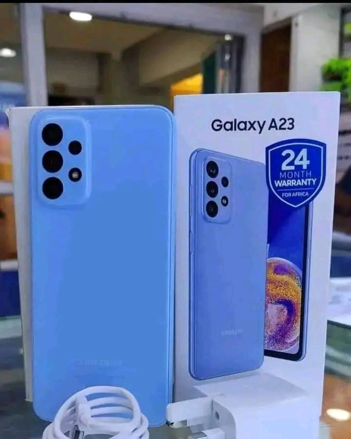 Brand: SAMSUNG A23 Main Camera: Quad50 MP + 5 MP + 2 MP + 2 MP. Selfie Camera: Single, 8 MP. Software: Android 12, One UI 4.1. Sensors: Fingerprint (side-mounted), unspecified sensors. Storage: 128GB Internal 4GB RAM. Battery: Li-Po 5000 mAh, non-removable. Charging: Fast charging 25W