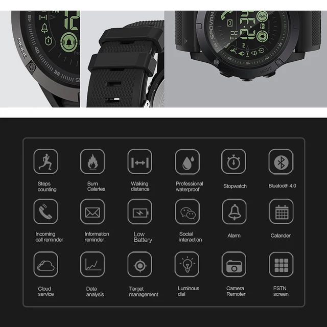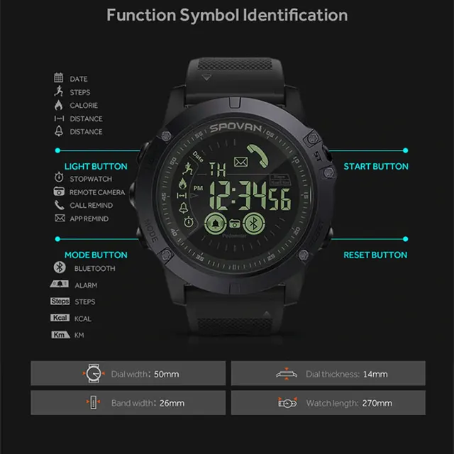 Multifunction for Daily Use , Stopwatch , Back Light【just for emergency use at night, but in bright places and during the day, the LED is NOT very obvious】 , Calendar(Week/Date/Month) , Alarm , Remote Camera , Low Power Reminder , Case Diameter 50MM(1.97") , Case Thickness 14MM(0.55") , Band Width 26MM(1.02") , Max Perimeter 250MM(9.84") , Min Perimeter 170MM(6.69") , Weight 62g