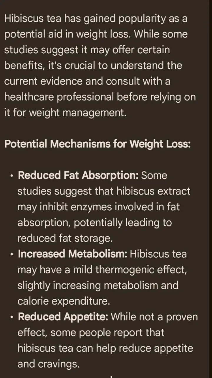 * **Increased Metabolism:** Hibiscus tea may have a mild thermogenic effect, slightly increasing metabolism and calorie expenditure.