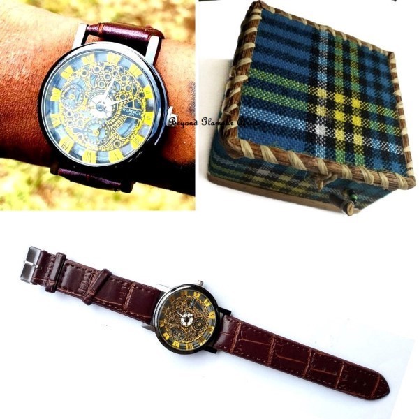 Unisex Maroon Leather Tone Skeleton Watch with gift box