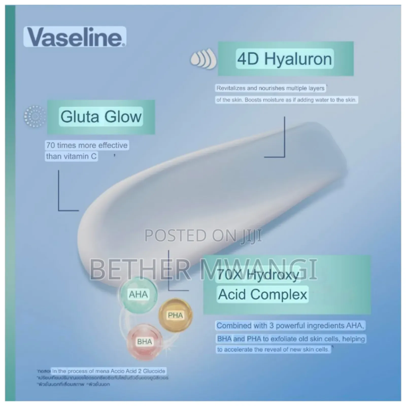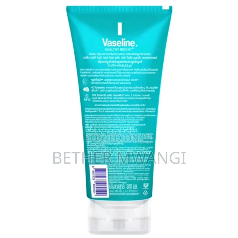 Vaseline Healthy Bright Gluta-Hya Serum Burst Lotion Smoothing Perfector Smoothing Perfector that is clinically proven to gently remove layers of dull skin, revealing smoother softer skin, pleasant to the touch, with the help of glutathione as one of the ingredients.