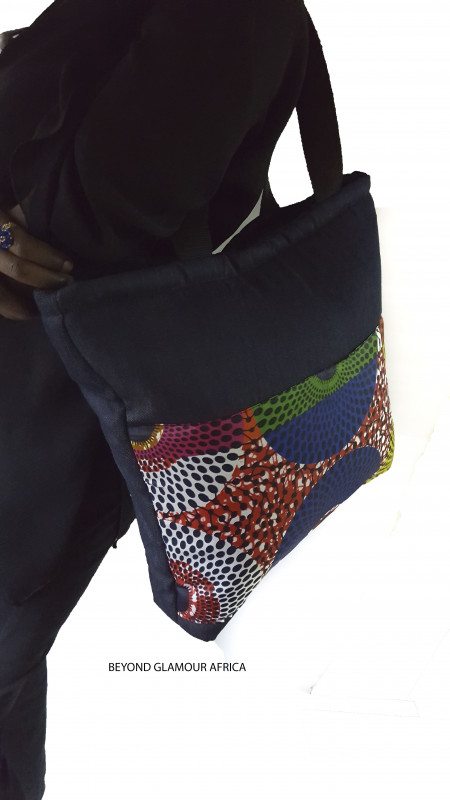 Simple and classy shoulder bag .denim blue with ankara print in the front.easy to carry and move around with,spacious enough with material that lasts long